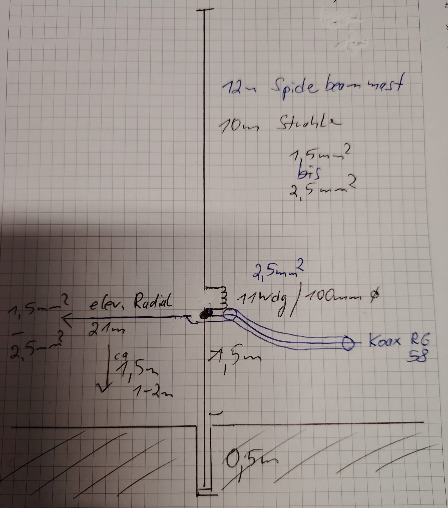 Die Antenne ist ein Rundstrahler, in Radialrichtung sind es nur 1 dB mehr. Viel Spaß beim LowBand DXng,am besten im Winter zum Sonnenflecken Minimum und in zwei Wintern danach. Diese Antenne ist also ein verkürzter Winkeldipol bzw. eine verkürzte upper and outer Antenne. Vy73 Richard